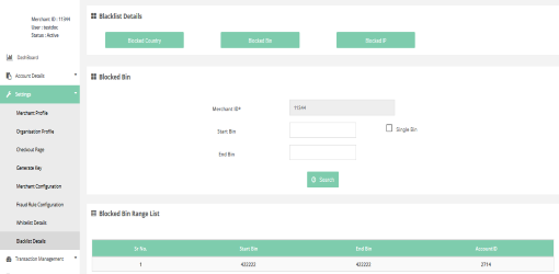 After login you need to click on "Blacklist Details" section under "Merchant Settings" tab in the left navigation panel of Merchant's back office. On the resulting page click on Blocked Bin button.