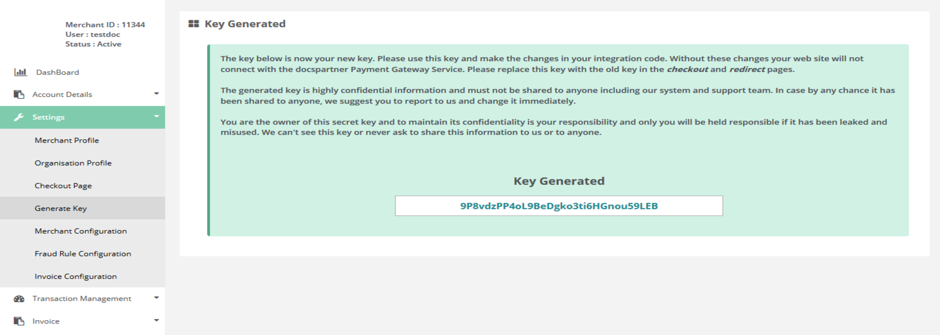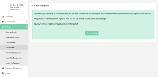 After login you need to click on Generate Key section under Settings tab in the left navigation bar of Merchant’s back office.
