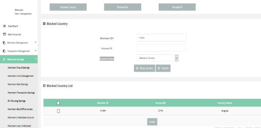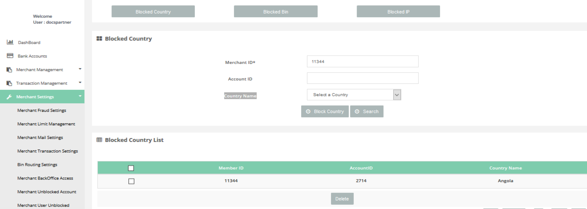 After login you need to click on "Blacklist Details" section under "Merchant Settings" tab in the left navigation panel of Partner's back office. On the resulting page click on "Block Country" button.