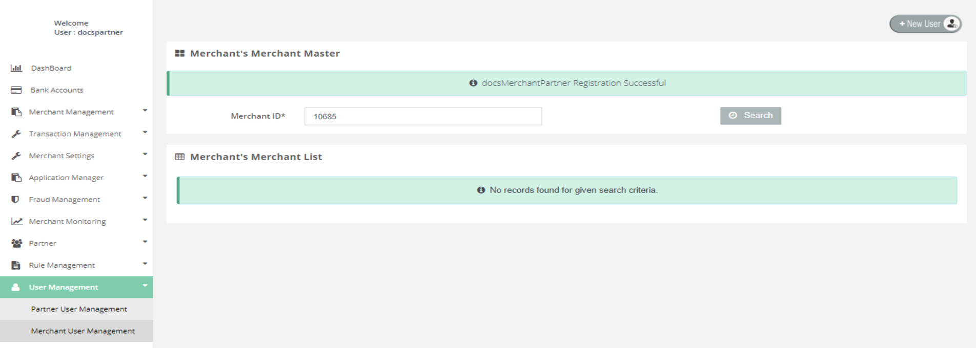 After Login, you need to click on the "Partner User Management" section under "User Management" tab in the left navigation panel of Partner's back office and then you need to click on "Add New User" button which is situated at rightmost top of the search filter.