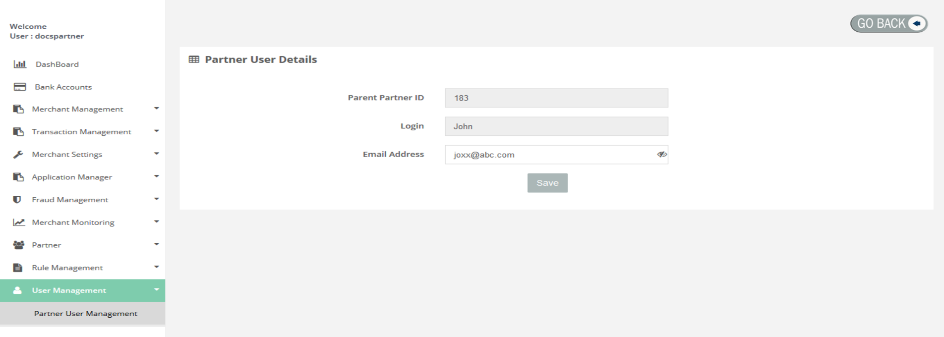 After Login, you need to click on the "Partner User Management" section under "User Management" tab in the left navigation panel of Partner's back office and then you need to click on "view" button.