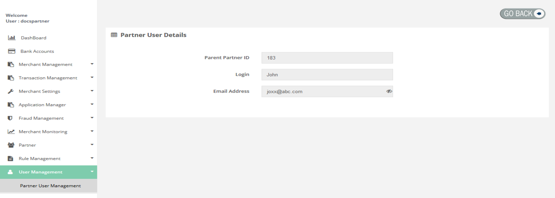 After Login, you need to click on the User Management section in the left navigation panel of Partner's back office. Then you have to click on search to get the list of users which allows you to "View" the user details by clicking on "View" button.