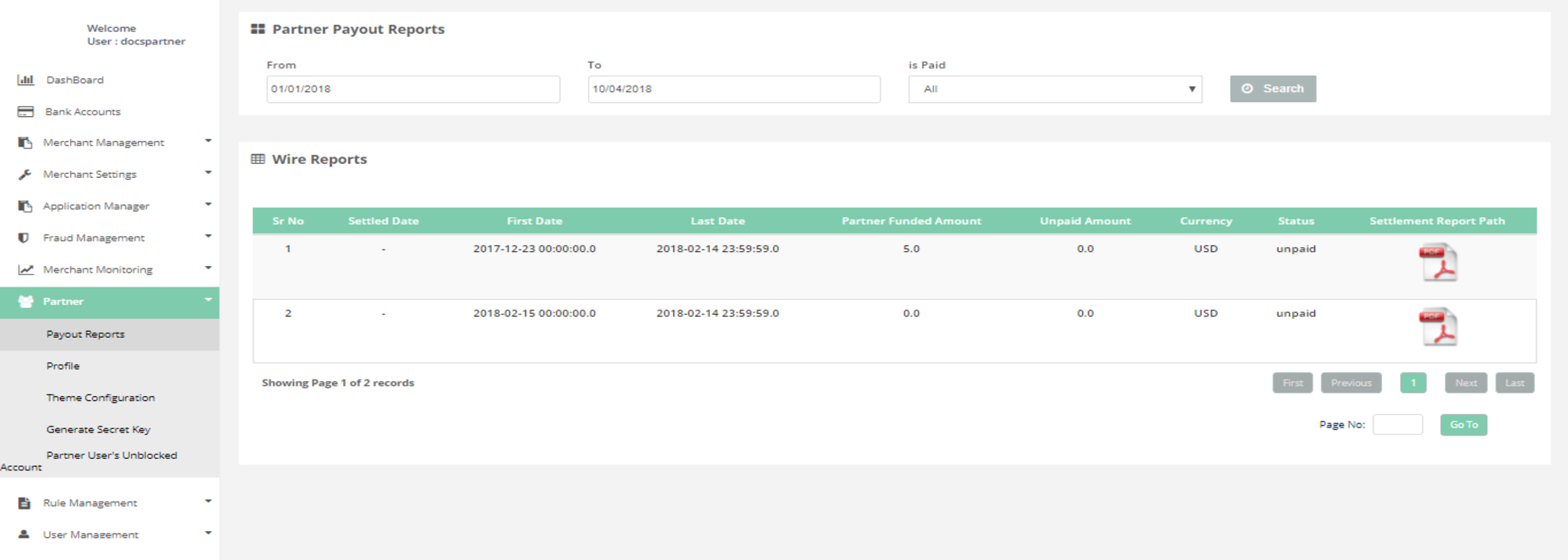 It displays payout report for the specific partner and can generate pdf of the payout report.