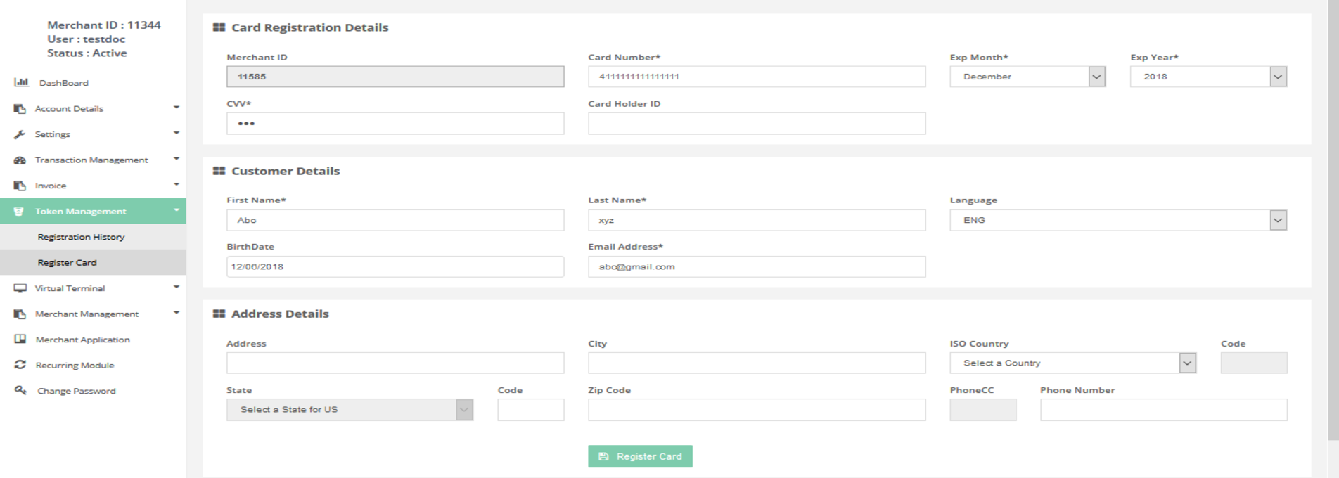 After Login you need to click on "Register Card" tab under "Token Management" section in the left navigation pannel of Merchant’s back office.