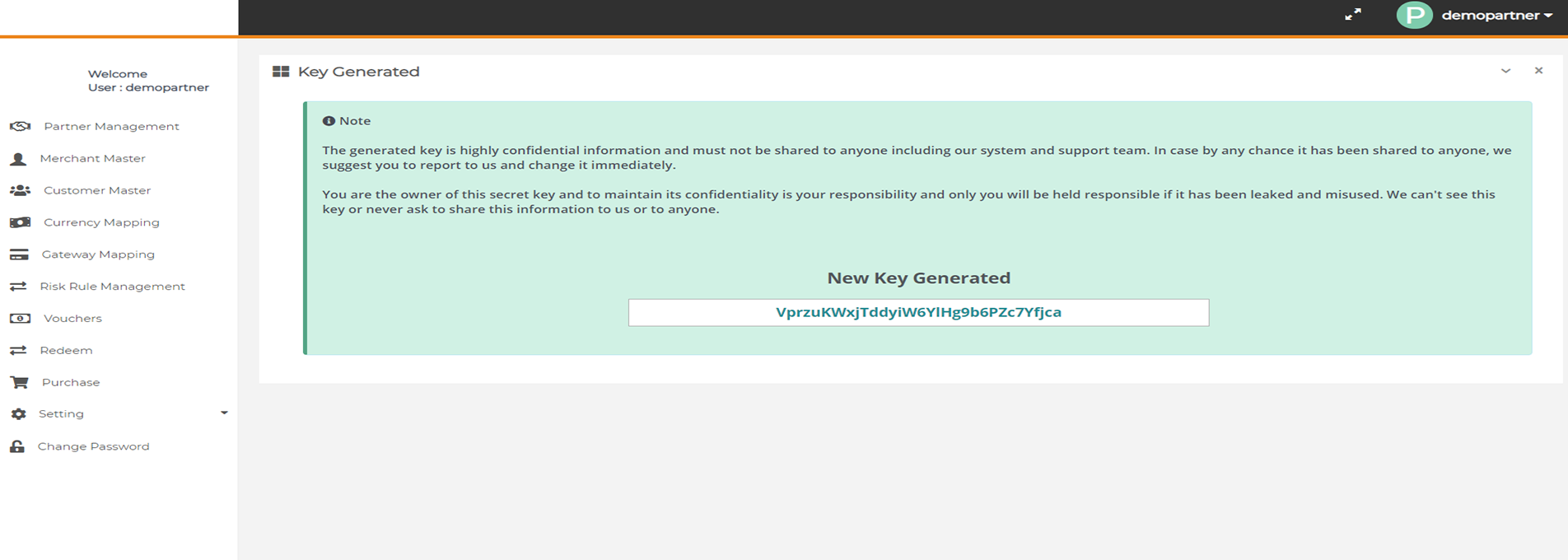 After login you need to click on "Generate Secret Key" section under "Settings" tab in the left navigation panel of Partner's back office.