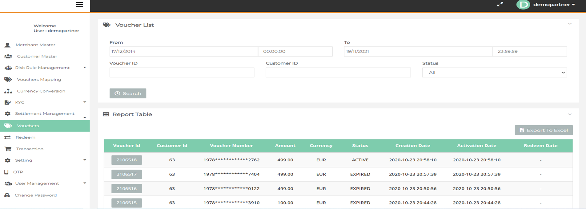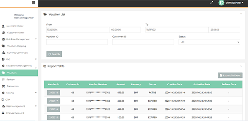 In this page you can view the Vouchers list, also you can export the voucher list to excel.